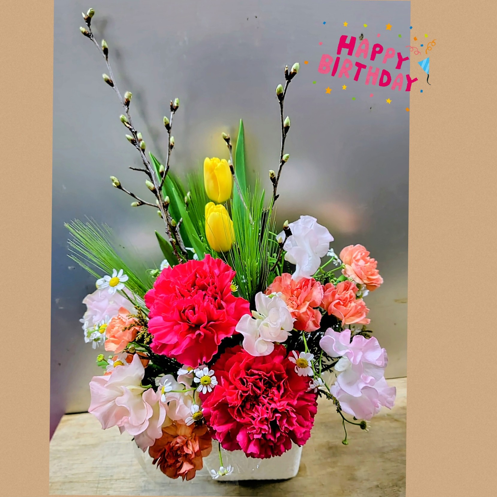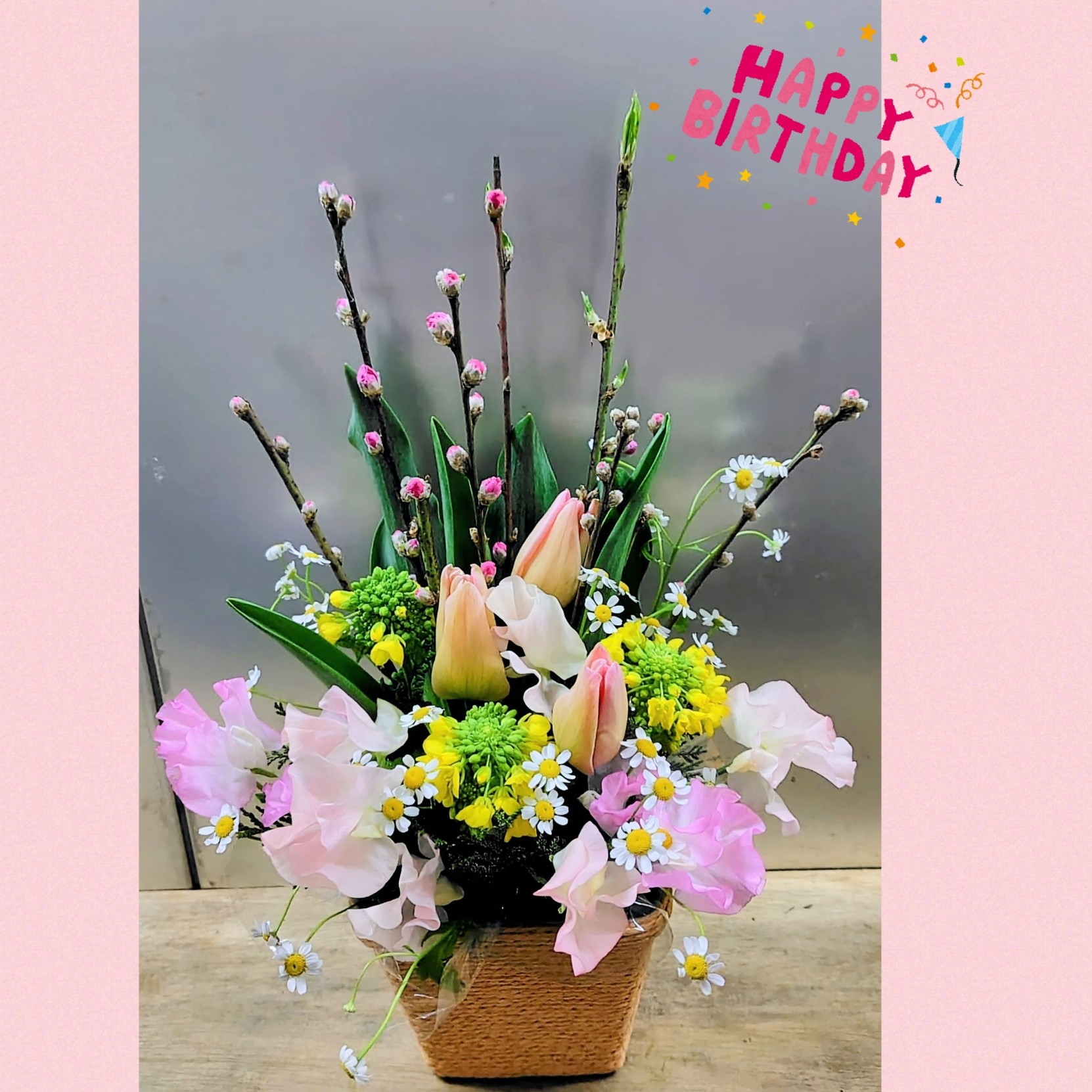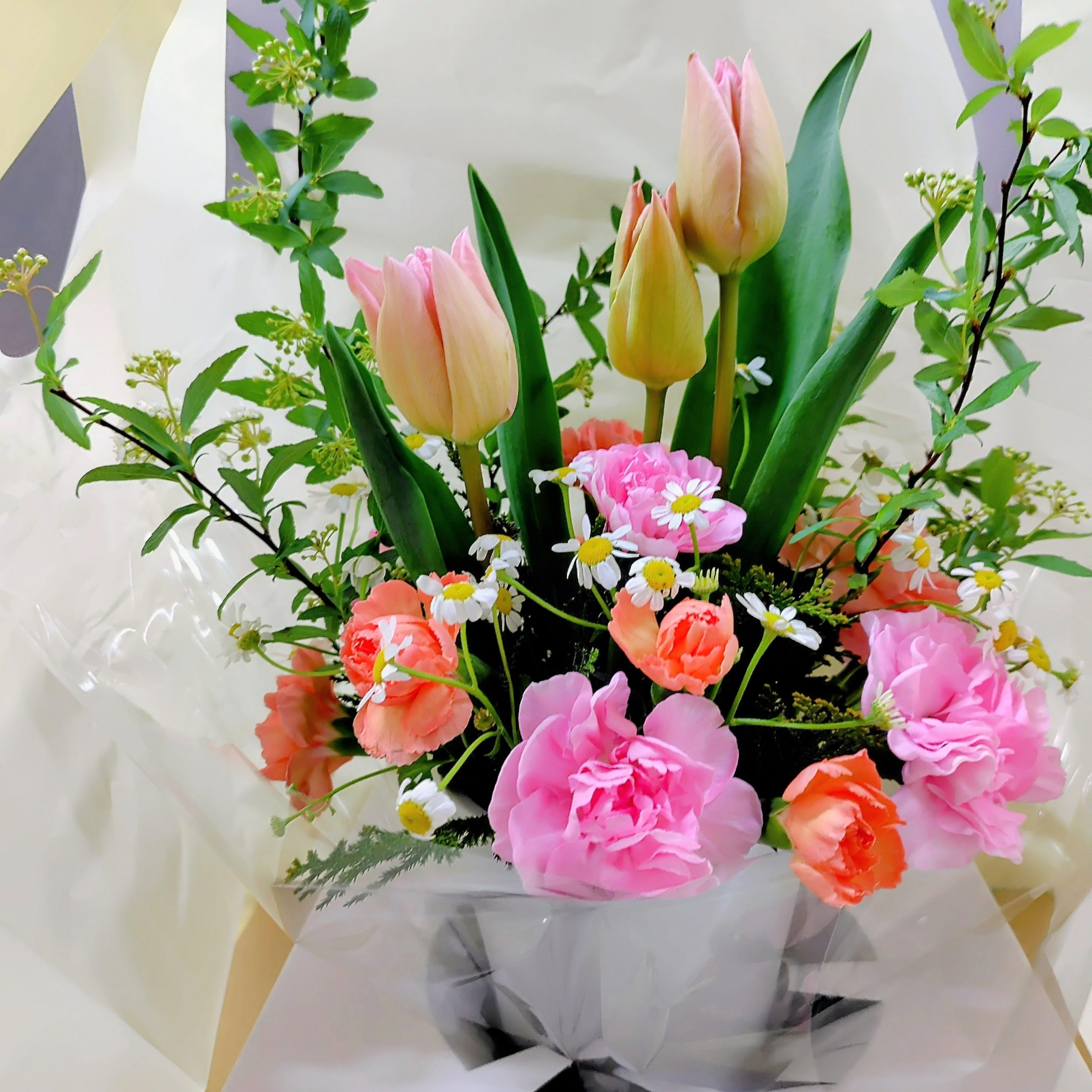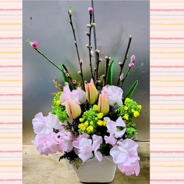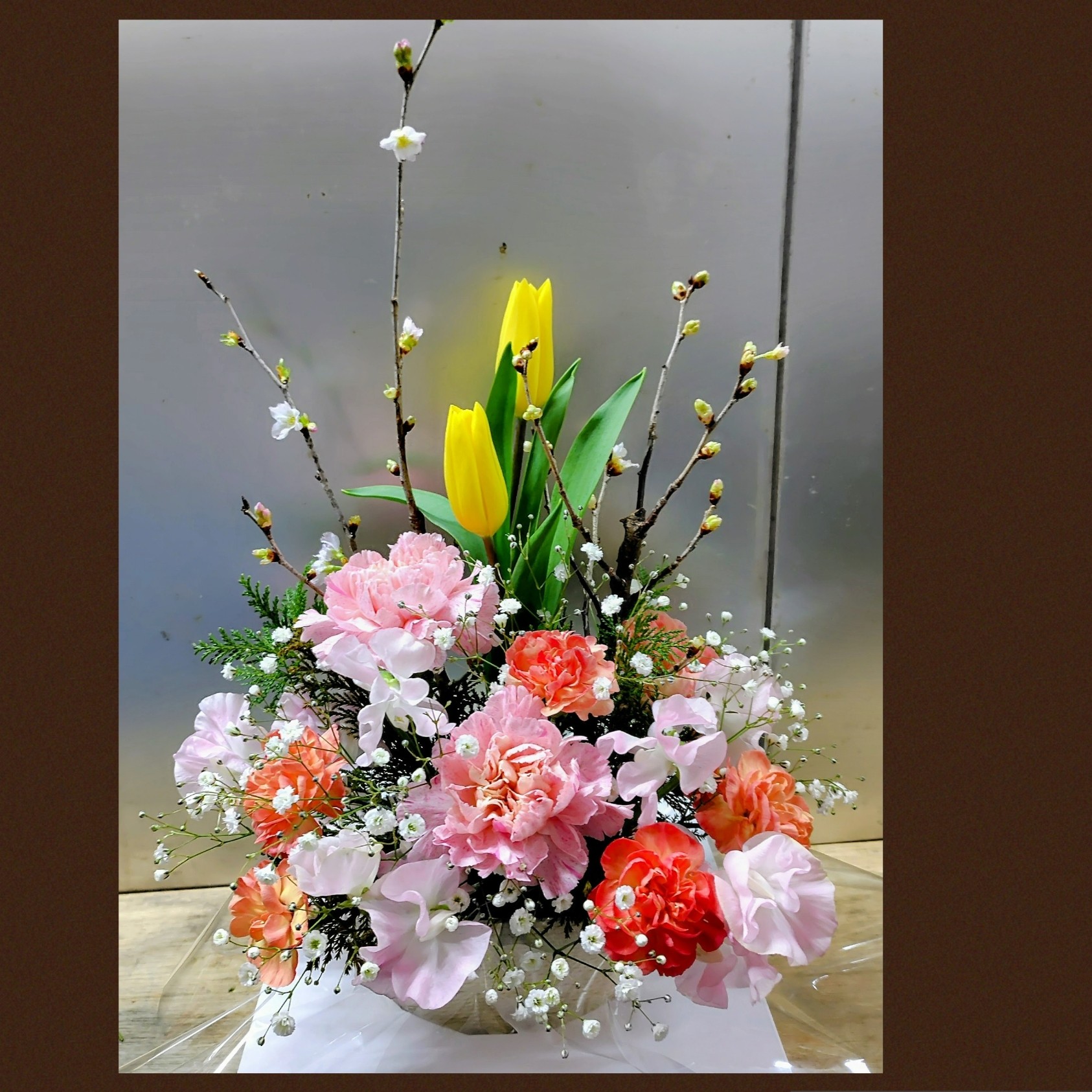 枝物とチューリップのアレンジメント